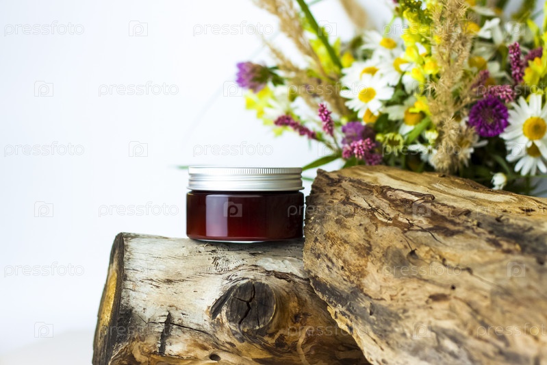 Баночка крема на фоне сухого пня, коры дерева и букета полевых цветов. Стильный внешний вид, планировка, индивидуальность. Баннер, место для текста
