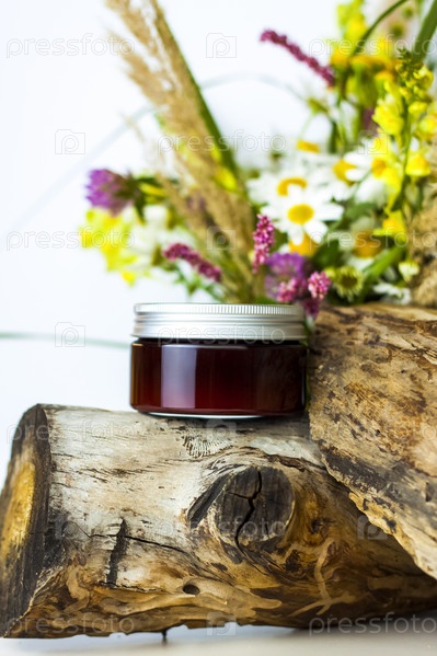 Баночка крема на фоне сухого пня, коры дерева и букета полевых цветов. Стильный внешний вид, планировка, индивидуальность. Баннер, место для текста