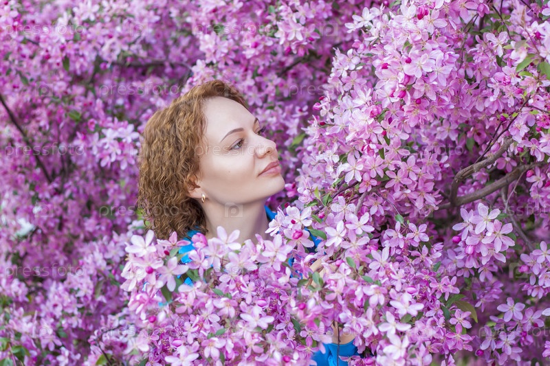 Портрет кудрявой девушки на фоне цветущего дерева. Девушка в розовых яблоневых цветах. Яблоня в цвету. Весеннее цветение яблоневого сада