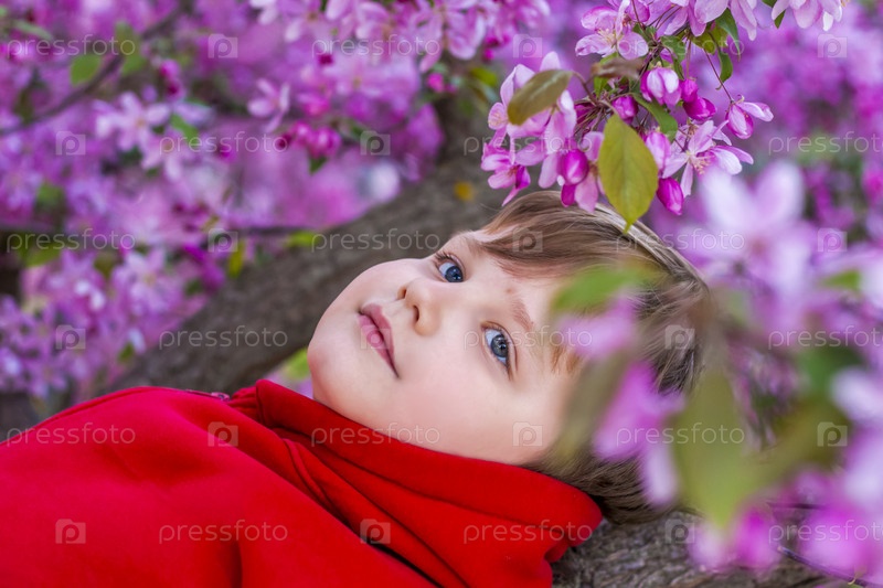 Портрет ребенка в розовых яблоневых цветах. Яблоня в цвету. Весеннее цветение яблоневого сада. Фон для презентаций, плакатов, баннеров и поздравительных открыток