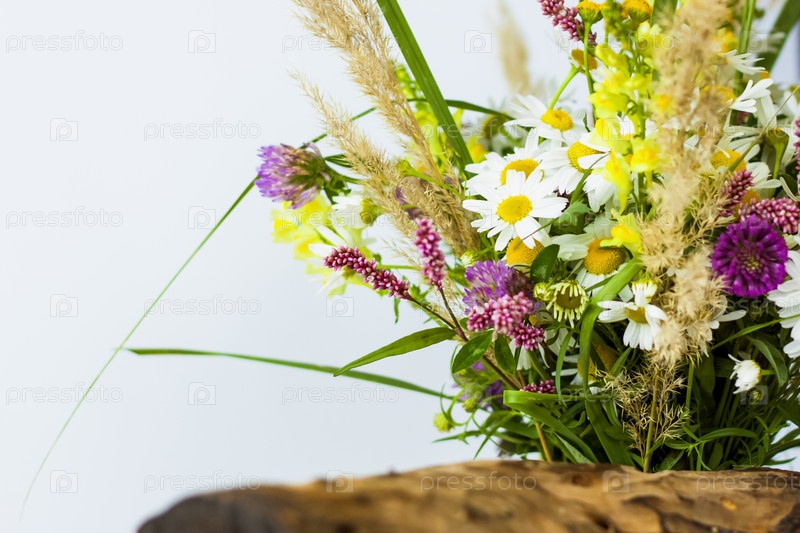 Сухой пень, кора дерева и букет полевых цветов в маленькой стеклянной вазе. Стильный внешний вид, планировка, индивидуальность