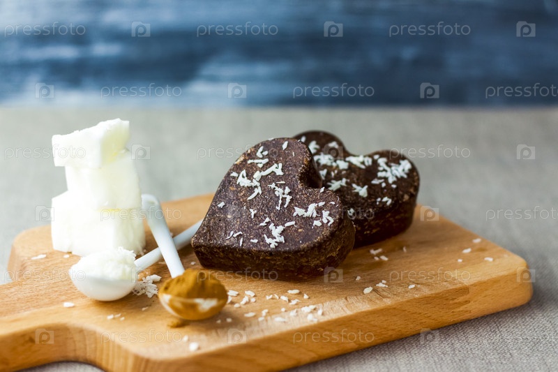 На столе конфеты ручной работы из кокосового масла, кокосовой стружки и какао. десерт по рецепту правильного питания