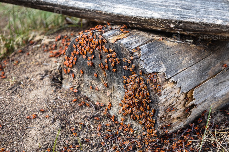 Европейский огневой клещ или pyrrhocoris apterus. жуки с красными пятнистыми спинами сидят на деревянной палочке