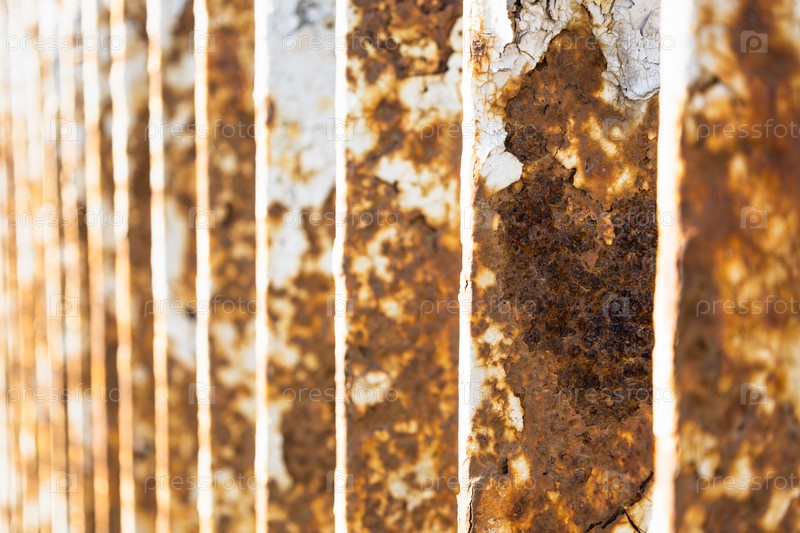 Металлические перила моста с коррозией, ржавчиной, глубокими трещинами и отслаивающейся текстурой краски