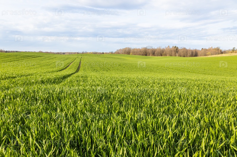 Сельское сельскохозяйственное поле, на фоне голубого неба и леса