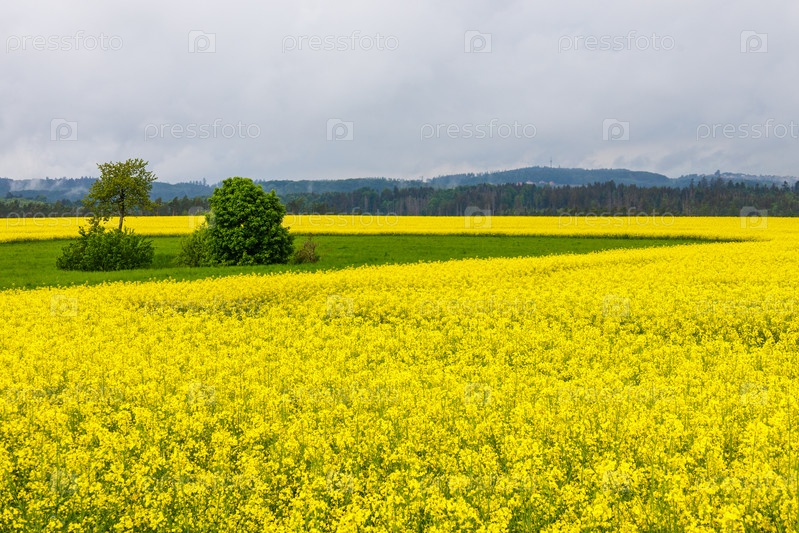 Желтое поле цветущего рапса и деревьев на фоне неба с облаками. Панорама рапсовых полей