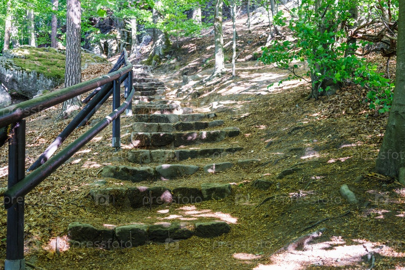 Каменная пешеходная дорожка с деревянными поручнями в горах