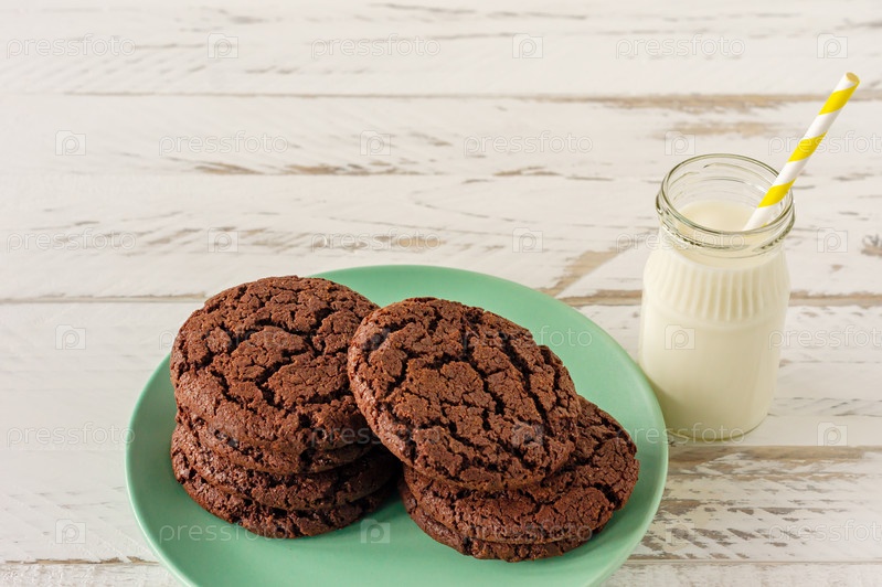 Шоколадное печенье на завтрак со стаканом молока на белом деревянном столе