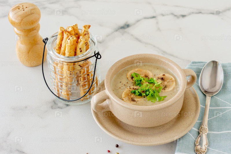 Грибной крем-суп с гренками, травами и специями на мраморном фоне