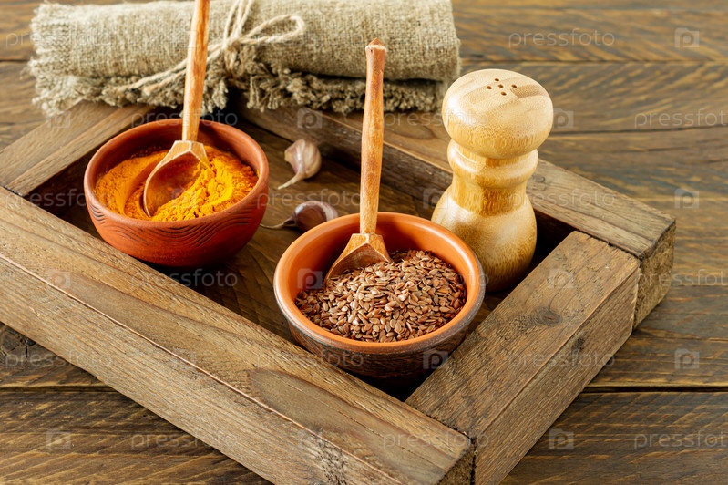 Ассортимент специй в глиняных мисках в деревянной коробке, крупным планом