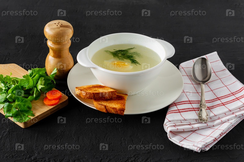 Домашний куриный бульон или бульон. здоровый ужин. черный бетонный фон