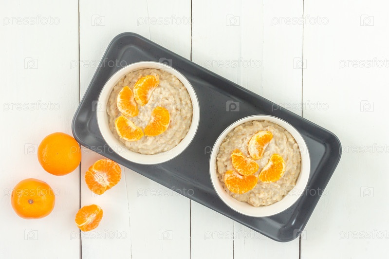 Легкая калорийная каша. Овсянка с сочными мандаринами и семенами льна без льна в мисках на мешковине, на белом фоне. Рецепт низкокалорийной каши