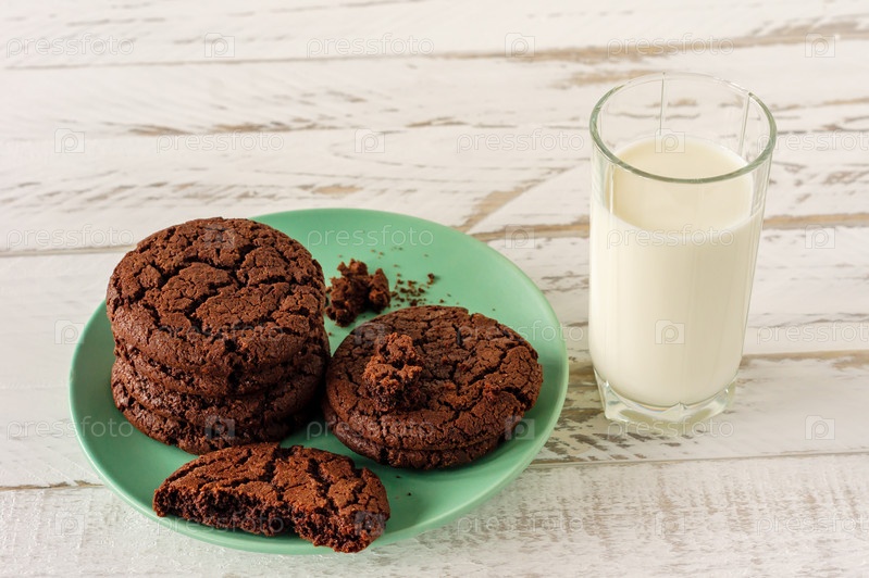Шоколадное печенье на завтрак со стаканом молока на белом деревянном столе