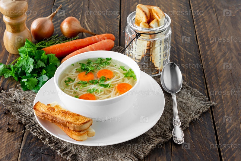 Куриный бульон в белой миске на деревенском деревянном фоне подается с гренками