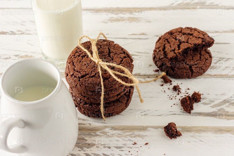 Шоколадное печенье на завтрак со стаканом молока на белом деревянном столе