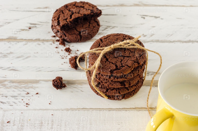 Шоколадное печенье на завтрак со стаканом молока на белом деревянном столе