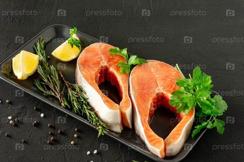 Свежий сырой стейк из лосося с лимоном, розмарином, перцем и петрушкой на черном фоне
