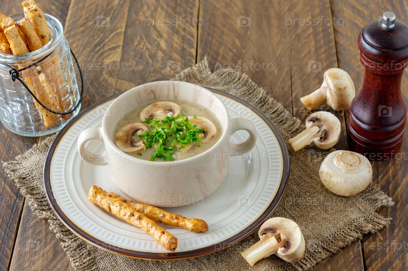 Грибной крем-суп с гренками, травами и специями на деревянном фоне