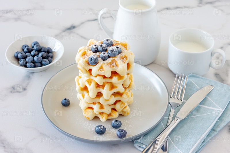 Домашние ванильные вафли с сахарной пудрой и черникой на тарелке, идеальный семейный завтрак