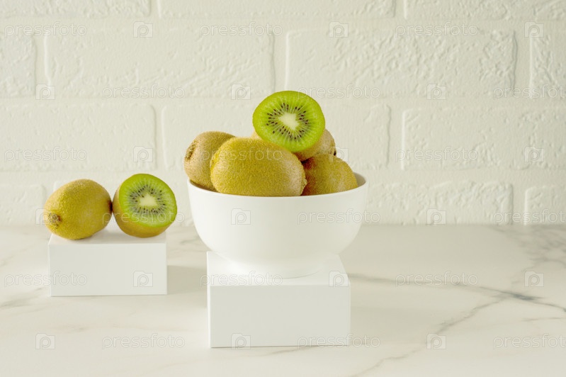Киви в белой миске на подиуме за мраморным кухонным столом. Свежие сочные тропические фрукты