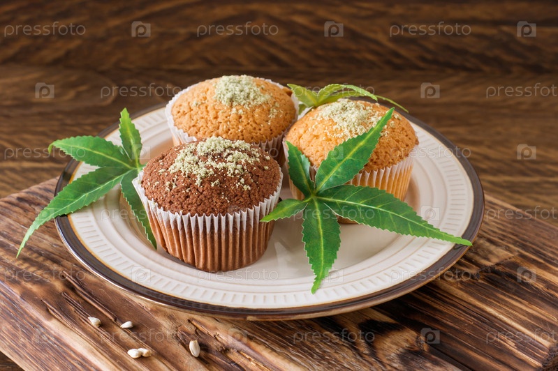 Здоровые и вкусные веганские и безглютеновые кексы с семенами конопли на белой тарелке на деревянном столе. Кексы с марихуаной и листьями конопли