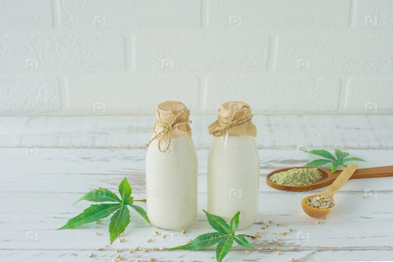 Бутылки с каннабисом, травяным веганским глютеном и безлактозным молоком и листьями конопли на деревянном столе