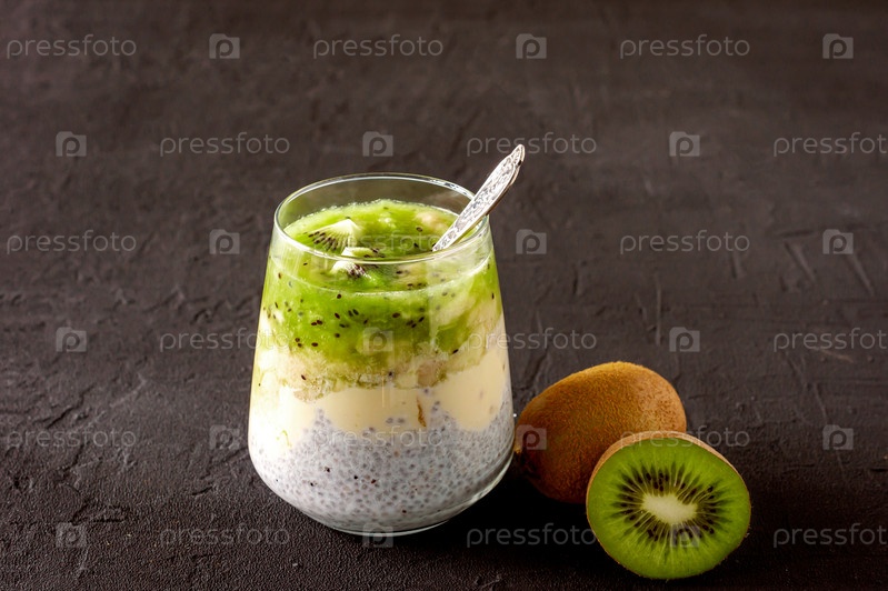 Пудинг из семян чиа с киви, бананом и манго. Оздоровительный детокс-завтрак в очках на черном бетонном фоне