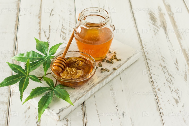 Конопляный мед в миске с деревянной ложкой, листья конопли и семена на деревянном столе