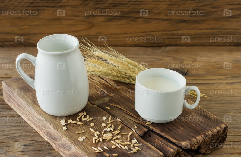 Овсяное молоко в стеклянном кувшине и овсянка в чашке на деревянном столе