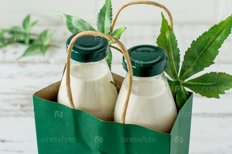 Бутылки с каннабисом, травяным веганским глютеном и безлактозным молоком и листьями конопли на деревянном столе