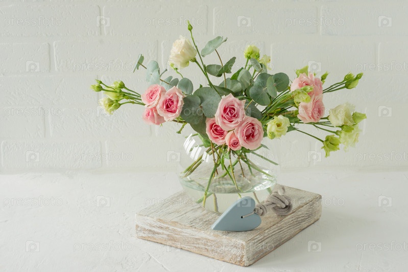 Букет роз, эустомы и эвкалипта в стеклянной стильной вазе на столе. Цветочная композиция для украшения интерьера