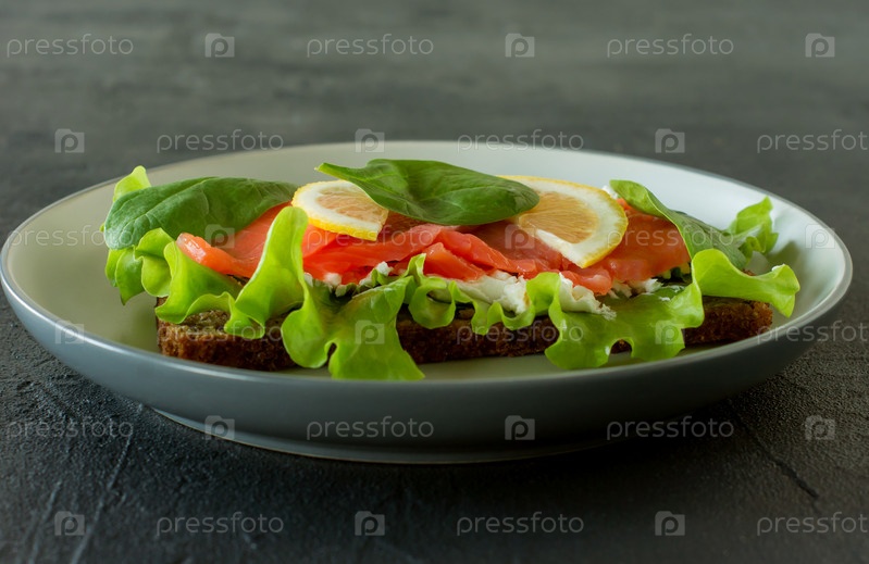 Сэндвич с мягким сыром из копченого лосося, решеткой и лимоном. Концепция вкусной и здоровой еды. Еда на тарелке