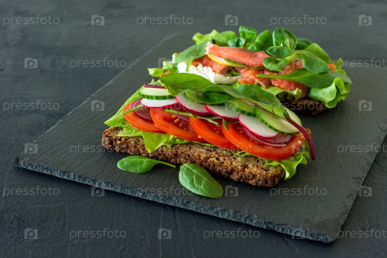 Овощи и копченые открытые бутерброды с творогом, решеткой, помидорами и лимоном на доске. Здоровый завтрак для диеты