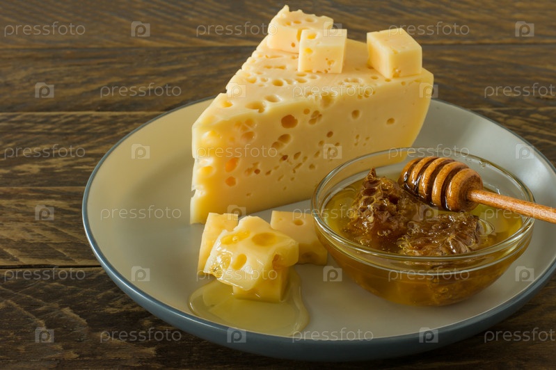 Сыр радамер на тарелке с медом. треугольный кусок желтого швейцарского сыра из коровьего молока с дырочками