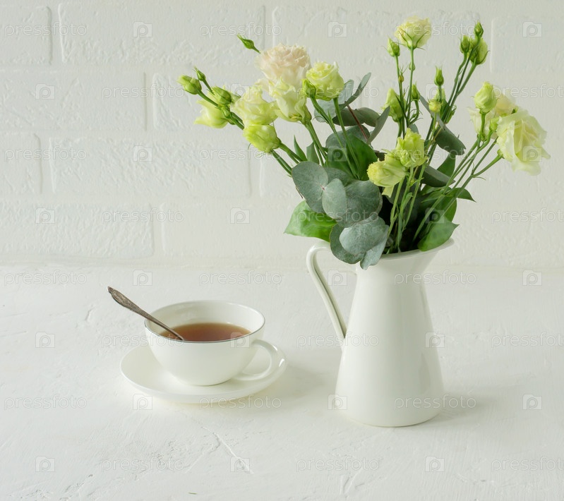 Букет красивых цветов эустомы на столе в столовой. Дизайн интерьера. Перерыв на кофе