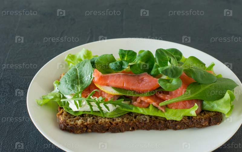 Сэндвич с мягким сыром из копченого лосося, решеткой и лимоном. Концепция вкусной и здоровой еды. Еда на тарелке