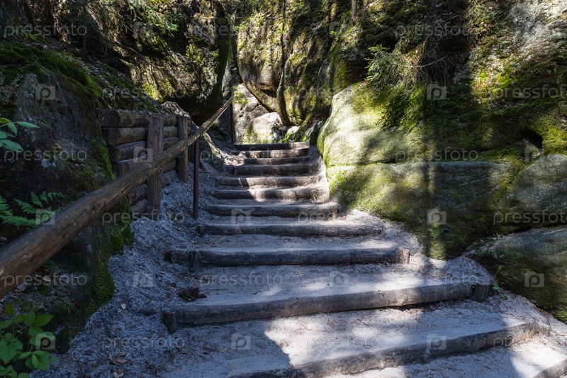 Туристическая тропа между скальными башнями и стенами в скалах Адршпах, Чешская Республика