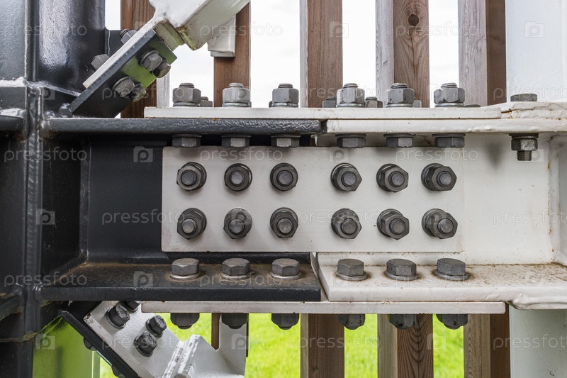 Крупный план многих гигантских болтов, соединяющих стальные балки