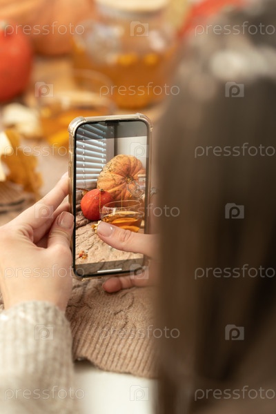 Девушка фотографирует тыквы, осенние листья и чайник на окне. Девушка фотографирует на телефоне деревенскую композицию хэллоуина. С Днем Благодарения и Хэллоуином