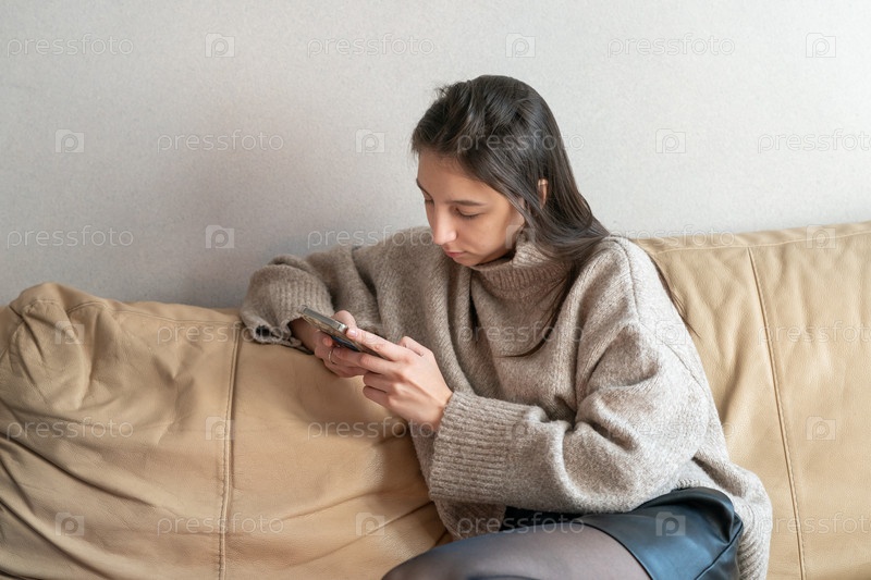 Девушка сидит на диване с телефоном в руках