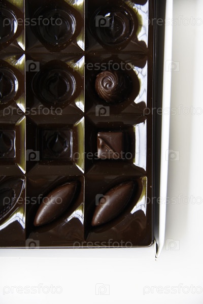 Коробка конфет на белом фоне. Вкусные сладкие конфеты в коробке