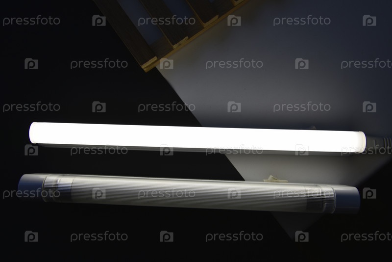 Светодиодная лампа на столе. Светящаяся люминесцентная лампа и светодиод на черном столе