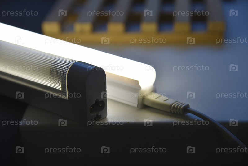 Светодиодная лампа на столе. Светящаяся люминесцентная лампа и светодиод на черном столе