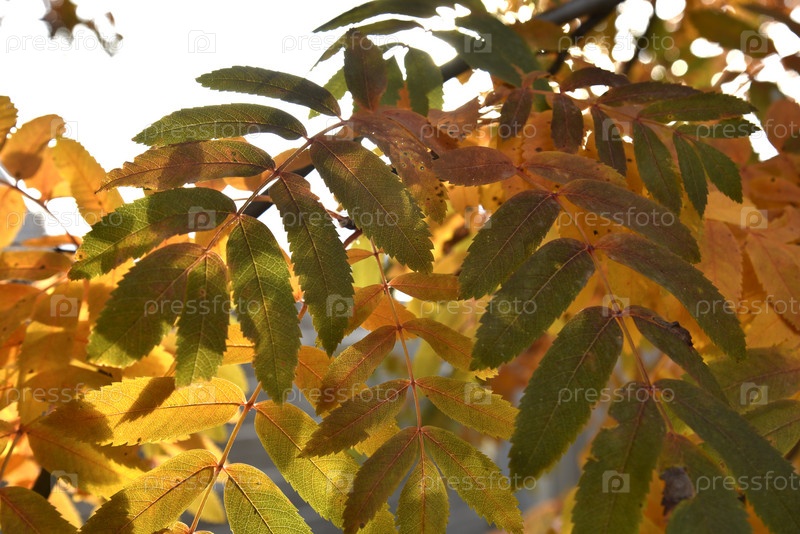 Красивые желто-красные листья рябины в лучах солнца осенью. Фон красивых осенних листьев рябины
