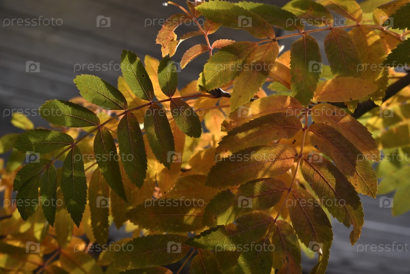 Красивые желто-красные листья рябины в лучах солнца осенью. Фон красивых осенних листьев рябины