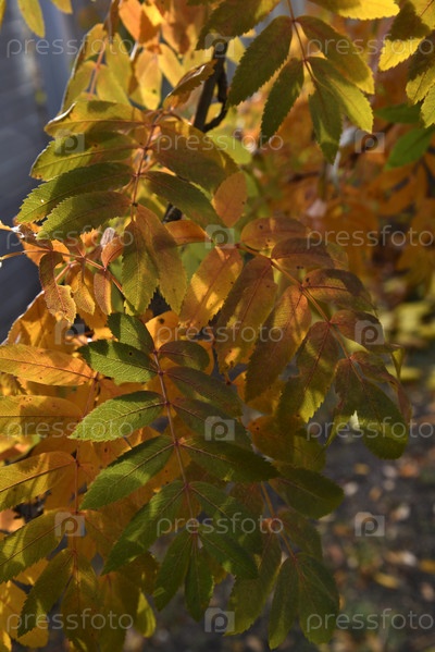 Красивые желто-красные листья рябины в лучах солнца осенью. Фон красивых осенних листьев рябины
