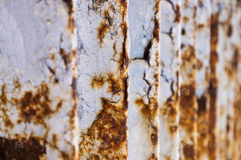 Металлические перила моста с коррозией, ржавчиной, глубокими трещинами и отслаивающейся текстурой краски