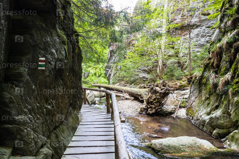 Деревянная пешеходная дорожка у водопадов Ресов в Чехии
