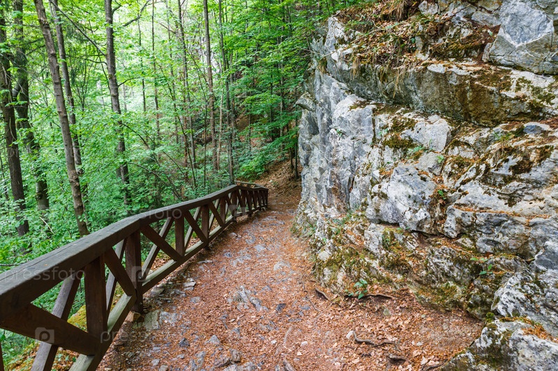 Пешеходная тропа в горах с деревянными поручнями
