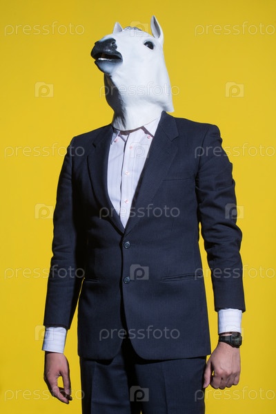Мужчина в маске лошади на желтом фоне